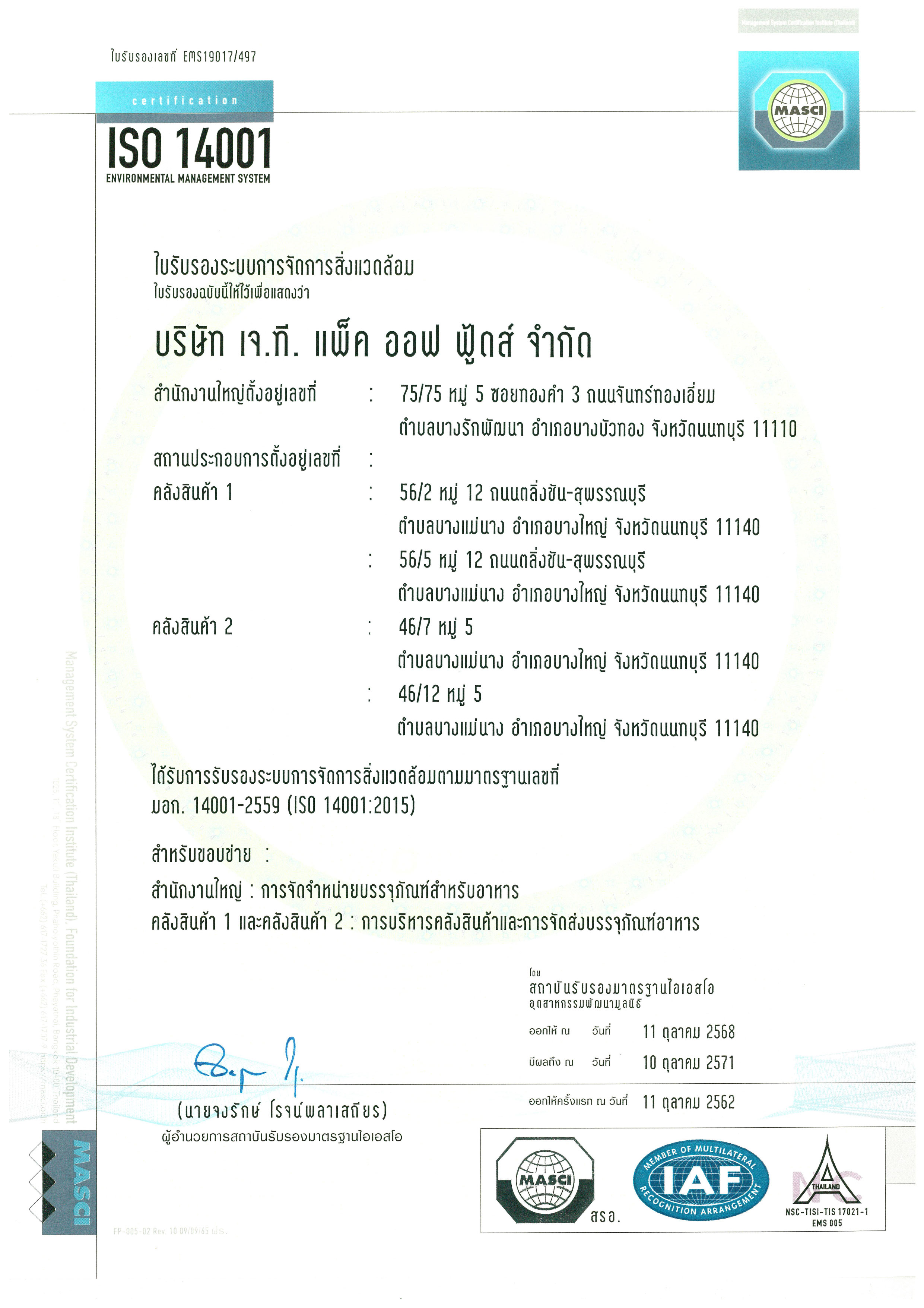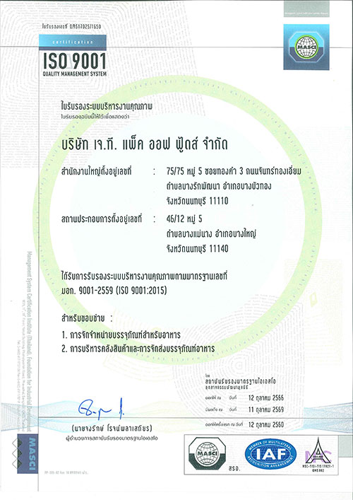 ISO : บริษัท เจ.ที.แพ็ค ออฟ ฟู้ดส์ จำกัด เข้าสู่ระบบ ISO เพื่อทำให้ลูกค้า มีความมั่นใจได้ว่าสินค้าของเราทุกชิ้นได้ผ่านกระบวนการที่เหมือนกัน การนำระบบประกันคุณภาพมาใช้ถือ ได้ว่าเป็นปรัชญาสำคัญที่จะนำไปสู่การประกันคุณภาพแบบครบวงจร ด้วยเทคนิคของ ISO จะสร้างความตระหนักในด้านคุณภาพแก่พนักงานทุกคน ความสำเร็จในการพัฒนาเข้าสู่ มาตรฐานสากลนั้นจะต้องคำนึงถึงการพัฒนาองค์กร ปัจจัยรอบด้าน รวมทั้งสภาพแวดล้อมภายนอกและภายใน และนำกลยุทธที่เน้นการเปลี่ยนแปลงองค์กร การจูงใจ การเปลี่ยนพฤติกรรม และการเปลี่ยนวัฒนธรรมองค์กร โดยเน้นการมีส่วนร่วม การให้ความรู้ อันจะทำให้ระบบคุณภาพอยู่อย่างถาวร ไม่ใช่ใบรับรองคุณภาพ ISO เป็นเพียงเฟอร์นิเจอร์อีกชิ้นหนึ่งขององค์กรเท่านั้น