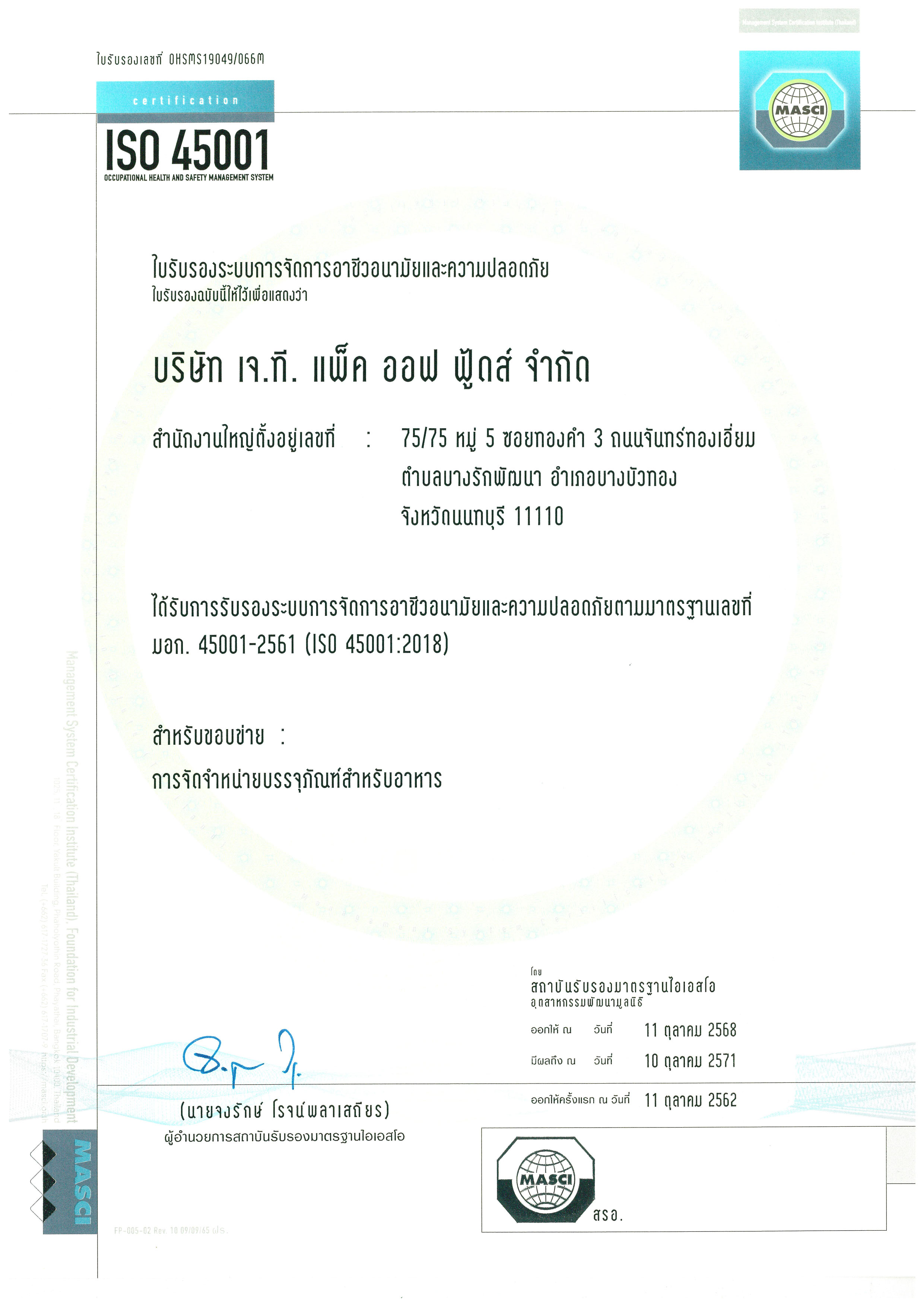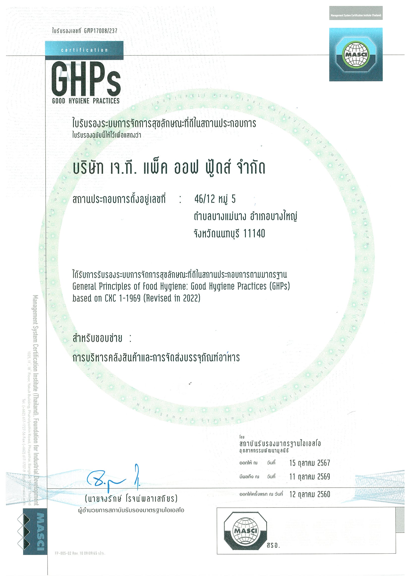 GMP : บริษัท เจ.ที.แพ็ค ออฟ ฟู้ดส์ จำกัด มุ่งมั่นพัฒนาระบบการผลิตผลิตภัณฑ์ของบริษัท ให้มีคุณภาพและมาตรฐานระดับสากลโดยยึดหลัก GMP เพื่อเพิ่มความปลอดภัยและใส่ใจต่อผู้บริโภค อีกทั้งเพื่อเพิ่มความเชื่อมั่นต่อผู้บริโภคว่าผลิตภัณฑ์ของบริษัทสะอาดปลอดภัยผลิตด้วยกระบวนการที่ได้มาตรฐานและได้รับการยอมรับในระดับสากล